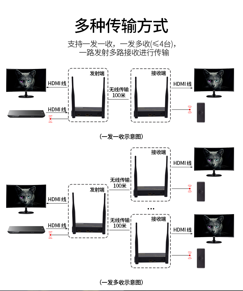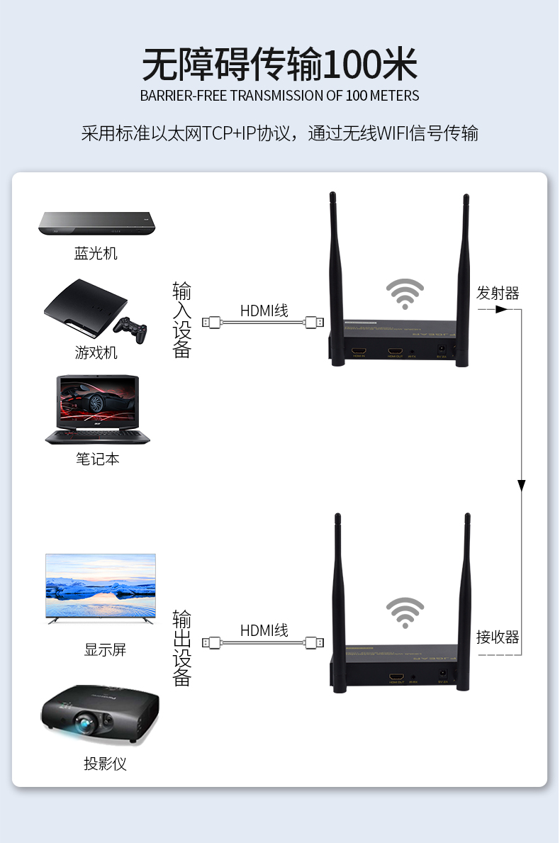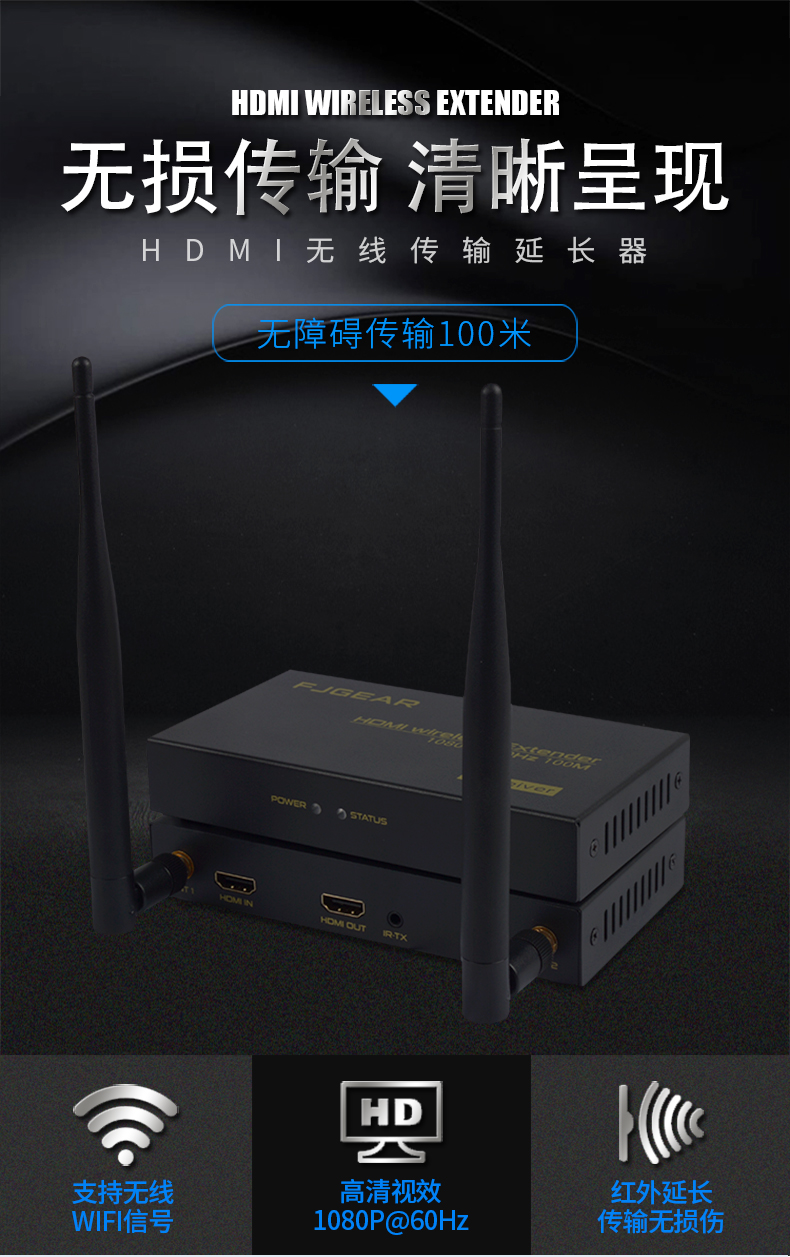 HDMI無線延長器采用無線TCP/IP協(xié)議通過無線信號5.8G頻段實現(xiàn)無線高清音視頻信號傳輸,