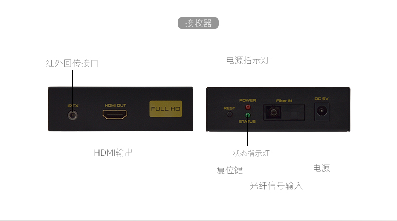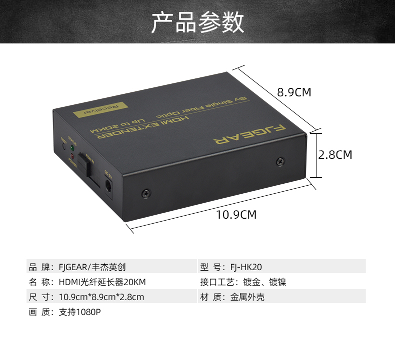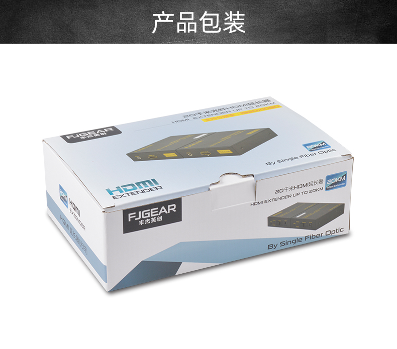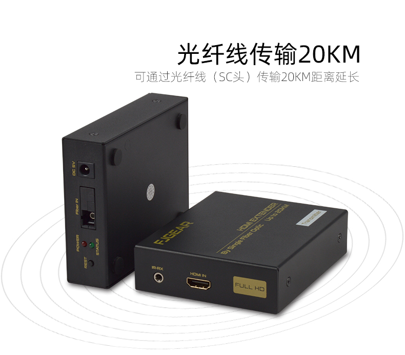 FJ-HK20是一款高清視頻延長器,傳輸介質是單模光纖線;它將一路HDMI高清信號通過一條單模光纖進行傳輸,