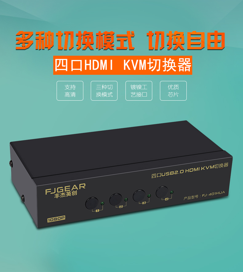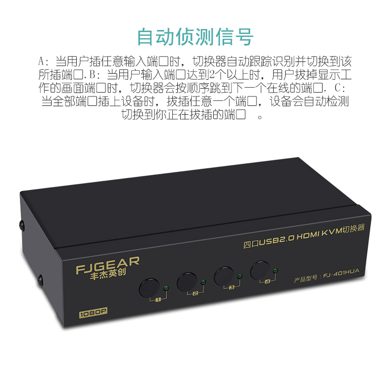 FJ-401HUA整合4端口KVM多電腦切換器,該款產(chǎn)品支持4臺電腦之間或是共它設(shè)備如游戲的HDMI信號切換,并讓使用者從單一控制端分享USB接口設(shè)備FJ-401HUA提供先進的獨立切換功能,使用者可通過前端面板按鍵及鍵盤熱鍵進行功能切換,該款產(chǎn)品同時具備顯示器動態(tài)同步顯示技術(shù),可保持最佳HDMI顯示器顯示分辯率。