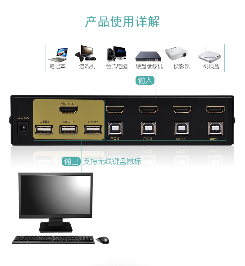 ? 一組USB控制端可管理4臺HDMI接口電腦及4臺USB接口設(shè)備;
