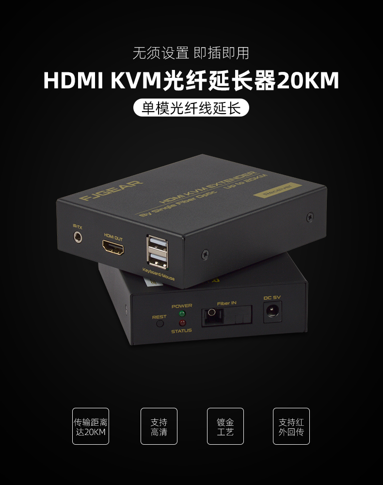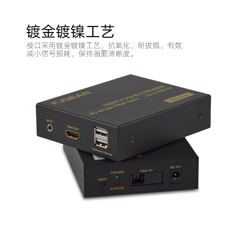 FJ-HUK20是一款高清視頻和USB鍵鼠的KVM延長(zhǎng)器,傳輸介質(zhì)是單模光纖線(xiàn);它將一路HDMI高清信號(hào)和USB鍵鼠信號(hào)通過(guò)