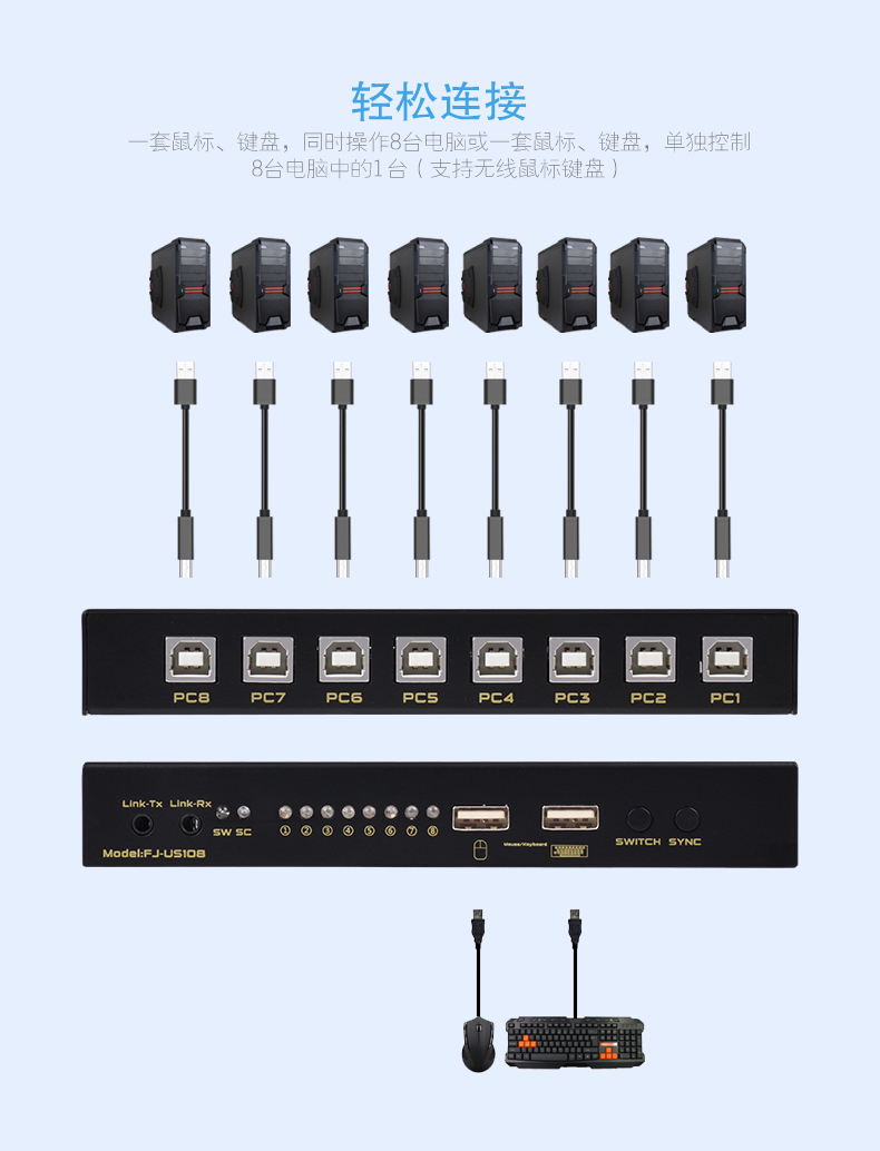 通過(guò)本產(chǎn)品你只需一套鼠標(biāo),鍵盤(pán)即可分時(shí),或者同時(shí)操作多臺(tái)電腦,主要廣泛應(yīng)用于辦公,教學(xué),娛樂(lè),軍事,游戲,信息等眾多平臺(tái),它為你節(jié)省時(shí)間,金錢(qián),設(shè)備,能源,大大提高你的工作效率,是你工作的好幫手。