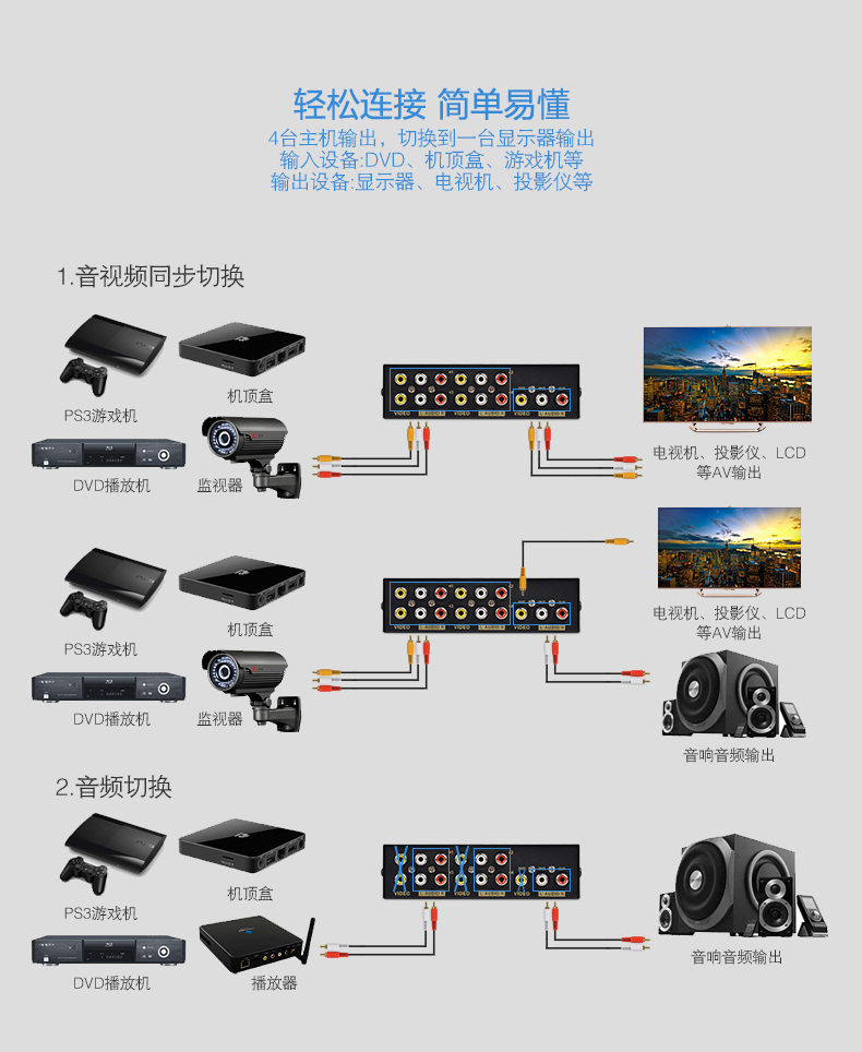 1、4路AV信號(hào)輸入,切換1路AV信號(hào)輸出;
