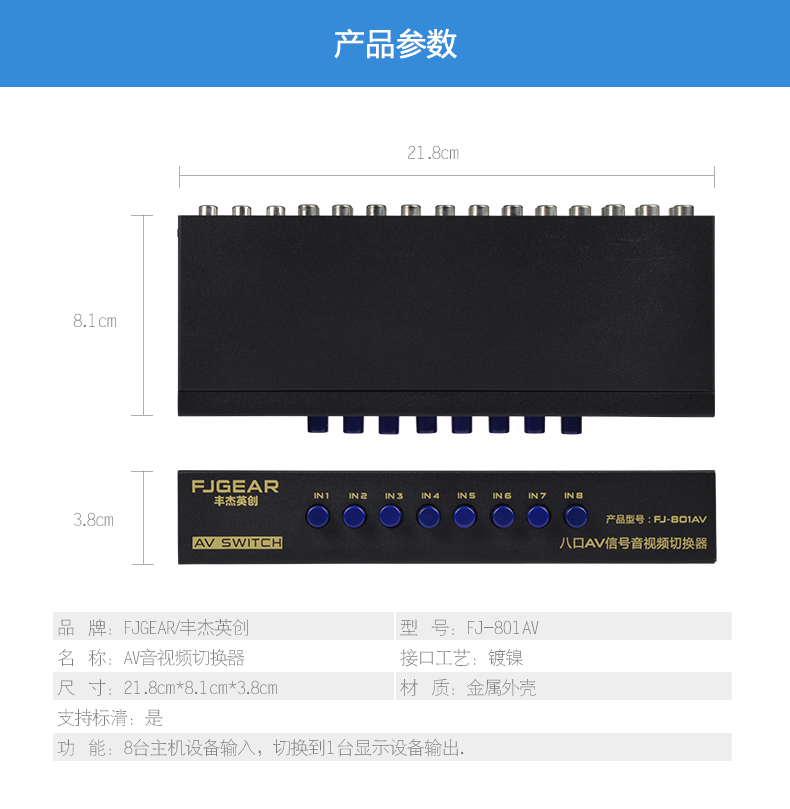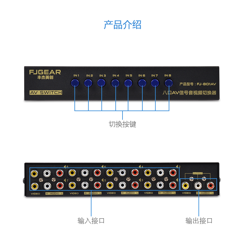 1、8路AV信號輸入,切換1路AV信號輸出;