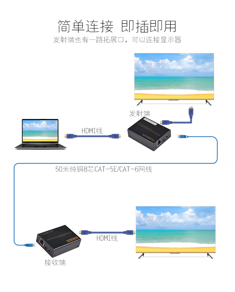 2.采用CAT-5E/6網(wǎng)線代替HDMI線來實現(xiàn)遠距離傳輸