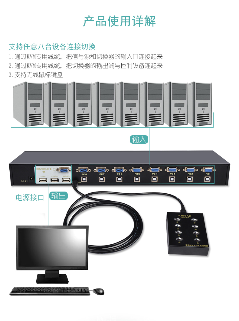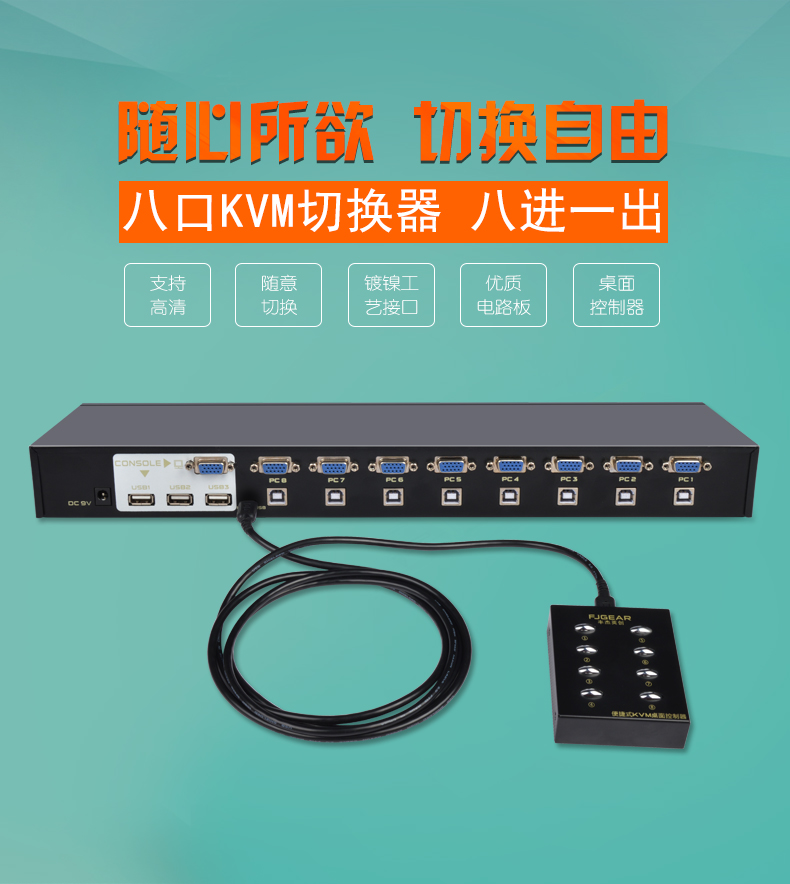 這是一款4口KVM切換器,它可以讓8臺電腦共享3個帶USB接口的設(shè)備(如打印機、掃描儀、多功能一體機、U盤、鼠標、鍵盤、無線藍牙設(shè)備),用按鍵即可輕松切換;極大的提高了辦公效率,同時也節(jié)省了采購成本和空間資源;這是家庭辦公及小型辦公場所的不二之選。