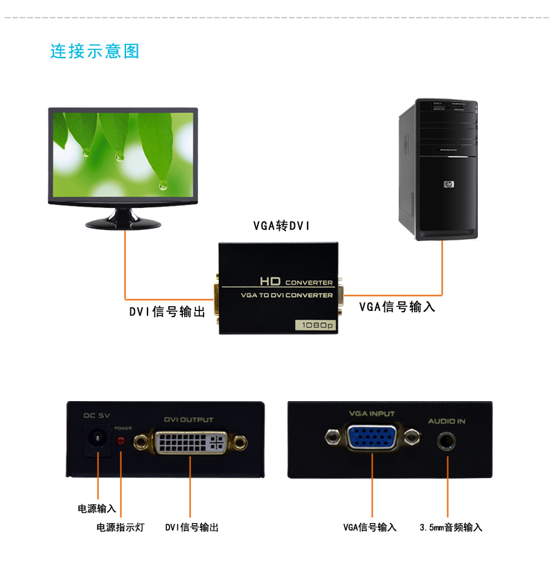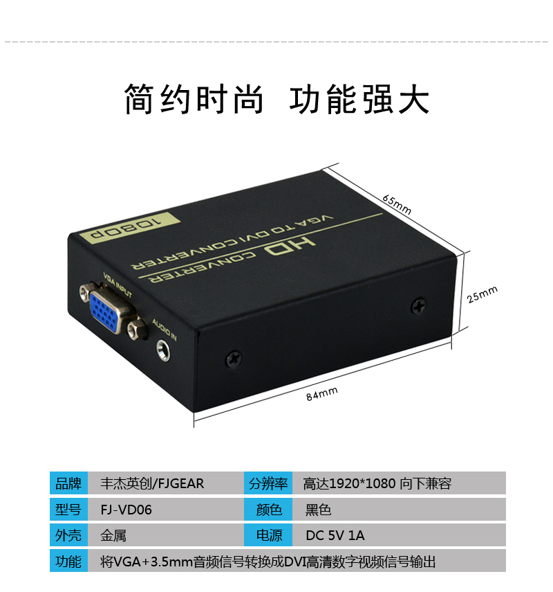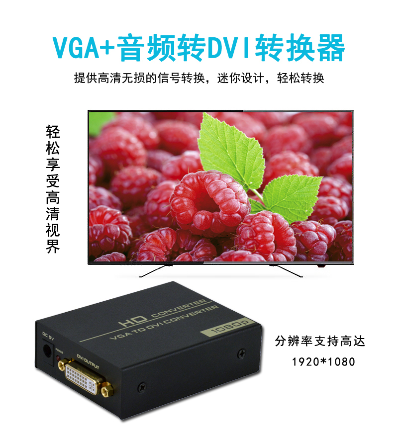 這是一款高清信號轉(zhuǎn)換器,通過智能芯片的處理,它可以將VGA模擬信號和AUDIO模擬信號轉(zhuǎn)換成一路DVI信號;產(chǎn)品廣泛運(yùn)用于臺式電腦/筆記本/DVD/機(jī)頂盒,播放器,攝像機(jī)等設(shè)備VGA信號源輸入,通過此轉(zhuǎn)換器連接后使高清電視,監(jiān)視器等顯示設(shè)備輸出DVI高清視頻信號,從而解決了用戶模擬轉(zhuǎn)數(shù)字的顯示設(shè)備解決方案,給您帶來美妙的高清視覺盛宴。