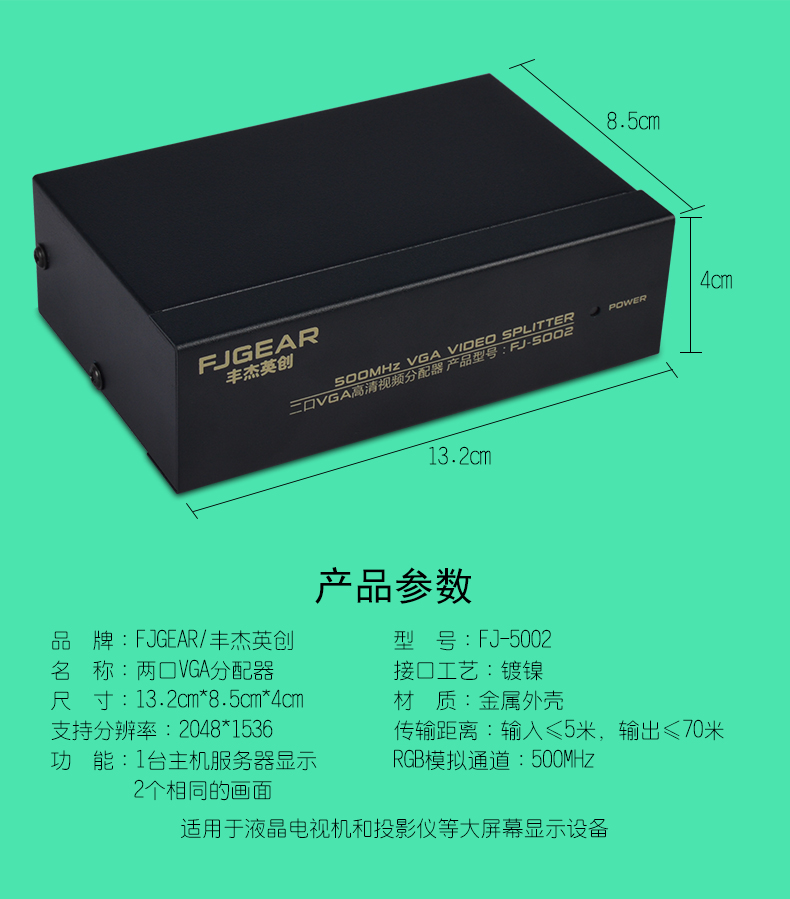 應(yīng)用于:視頻會(huì)議系統(tǒng),如:投影儀、大屏幕;VGA信號(hào)測(cè)試,如:顯示器、液晶顯示器;大眾傳媒如:服市行情、時(shí)刻表、教學(xué)場(chǎng)所;數(shù)據(jù)中心,咨詢臺(tái)等,通過它您只需要一臺(tái)主機(jī)便可共享2臺(tái)顯示器,它為您節(jié)省時(shí)間,金錢,設(shè)備,能源,是您工作的好幫手!