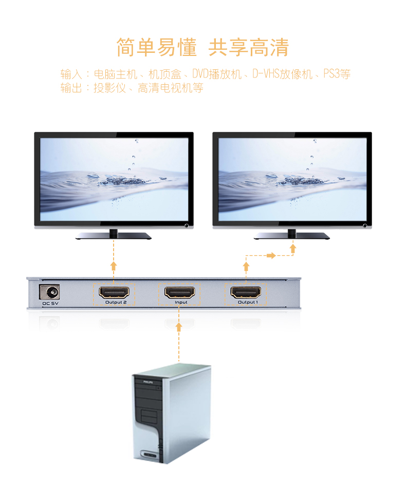 支持藍(lán)光DVD(3D)、網(wǎng)絡(luò)機頂盒、PC、NOTEBOOK,多媒體播放器,硬盤錄像機等等各類HDMI接口設(shè)備,帶復(fù)位功能