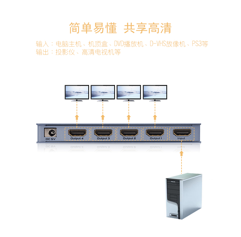 支持藍(lán)光DVD(3D)、網(wǎng)絡(luò)機(jī)頂盒、PC、NOTEBOOK,多媒體播放器,硬盤錄像機(jī)等等各類HDMI接口設(shè)備,帶復(fù)位功能